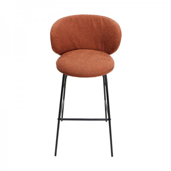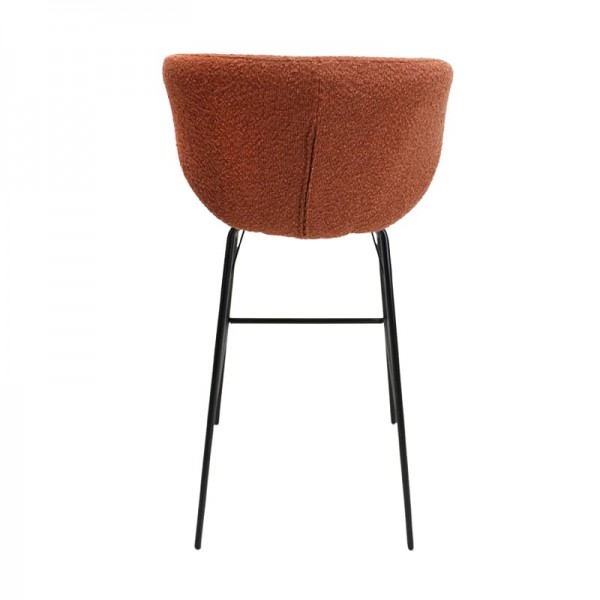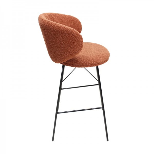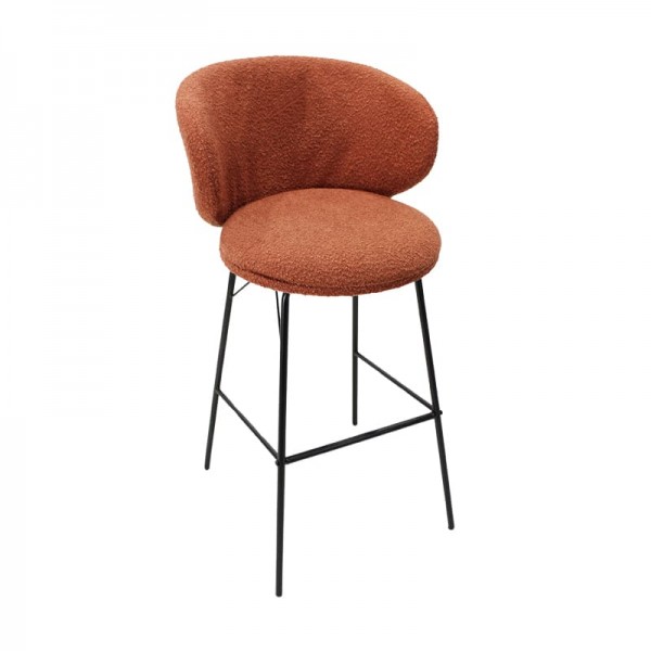 Banco con estructura metálica, asiento y respaldo tapizados en tela tipo lana.