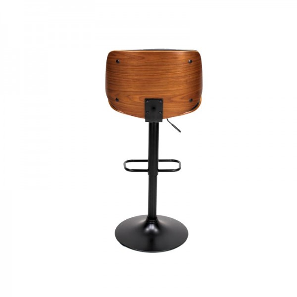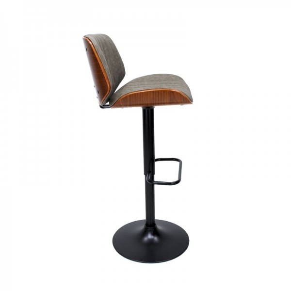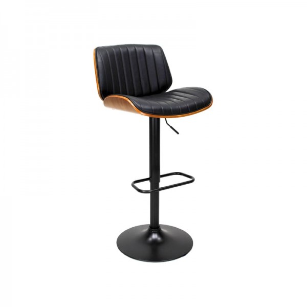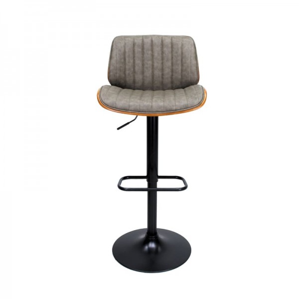 Banco de altura ajustable, base metálica circular con reposapiés y asiento con respaldo tapizados en vinipiel con detalle de madera