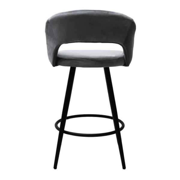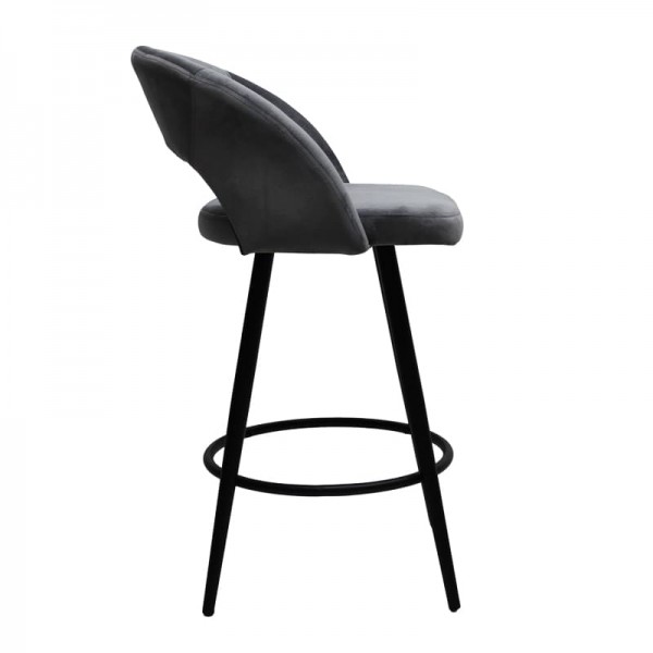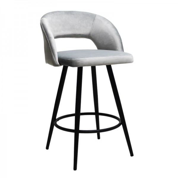 Banco con estructura metálica, asiento y respaldo forrado en tela tipo terciopelo.