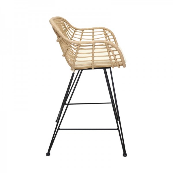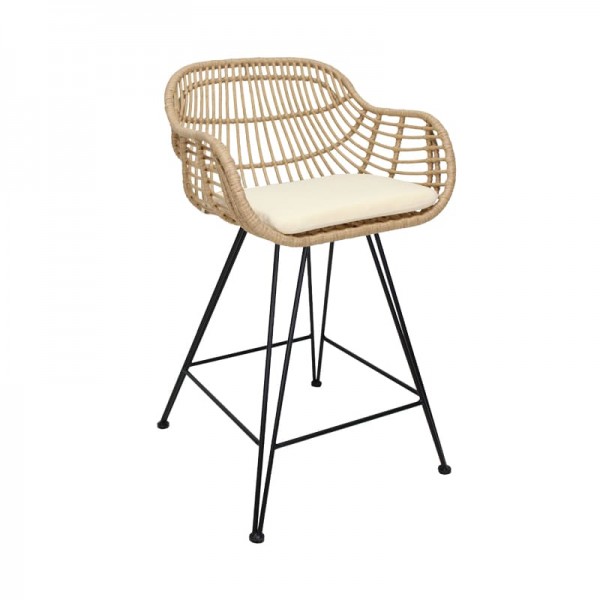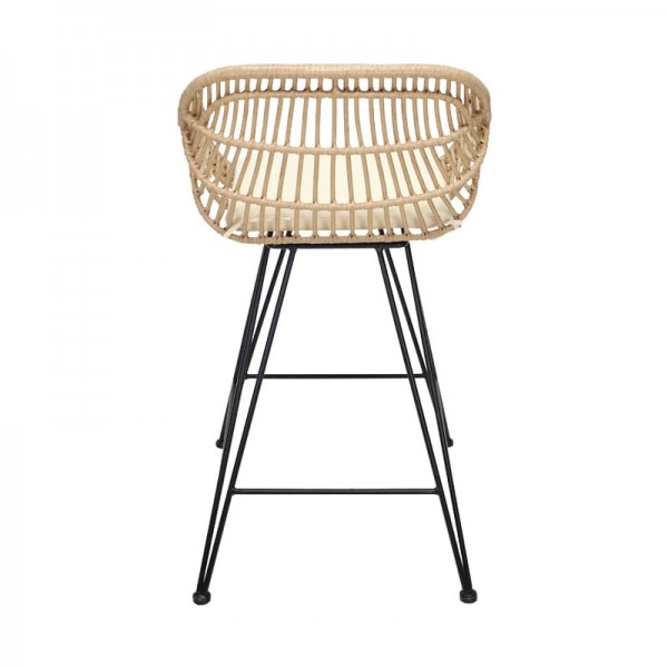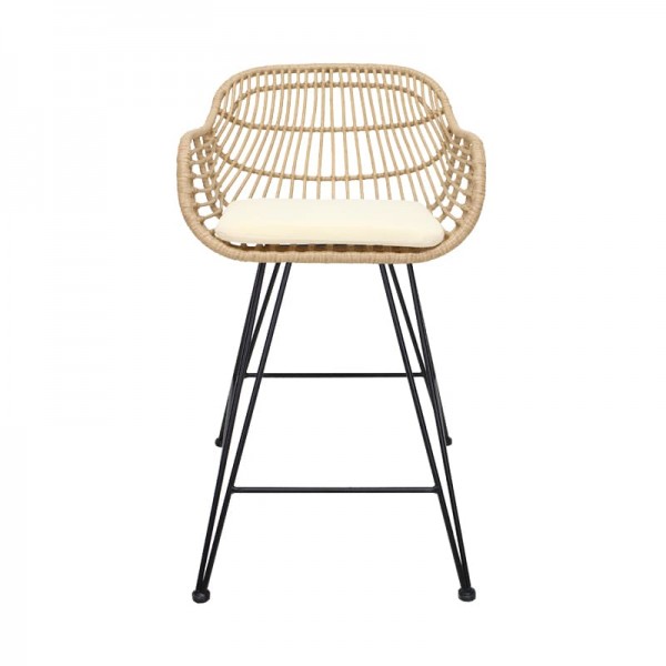 Banco con base metálica en acabado mate y asiento de ratán impermeable. Con cojín removible