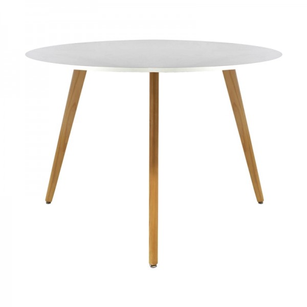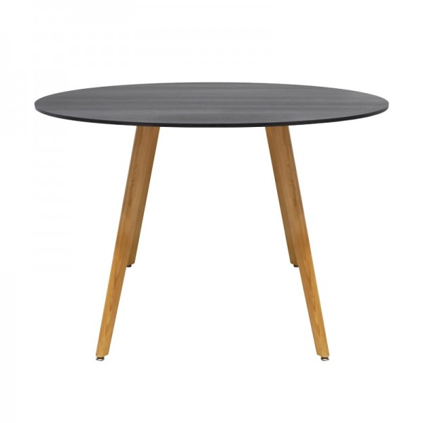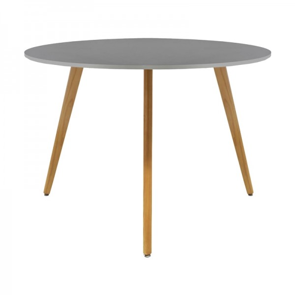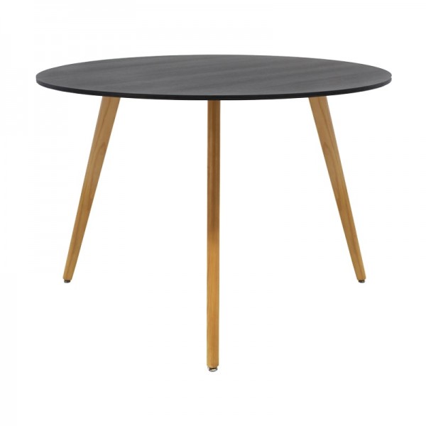 Mesa circular con estructura de madera y cubierta laminada de plástico.