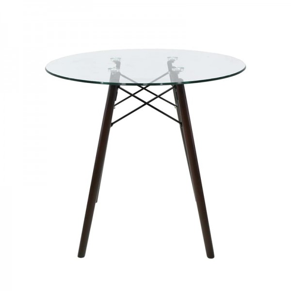 Mesa redonda ideal para 2 a 4 personas, estructura sólida de madera maciza y tirantes de metal negro, cubierta de vidrio biselado con bordes redondos.