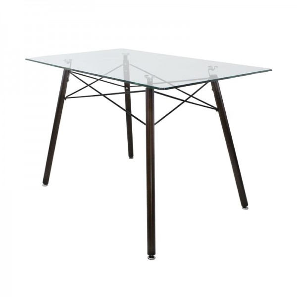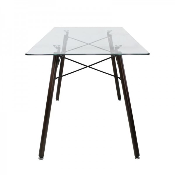 Mesa rectangular, estructura sólida de madera maciza y tirantes de metal negro, cubierta de vidrio biselado con bordes redondos.