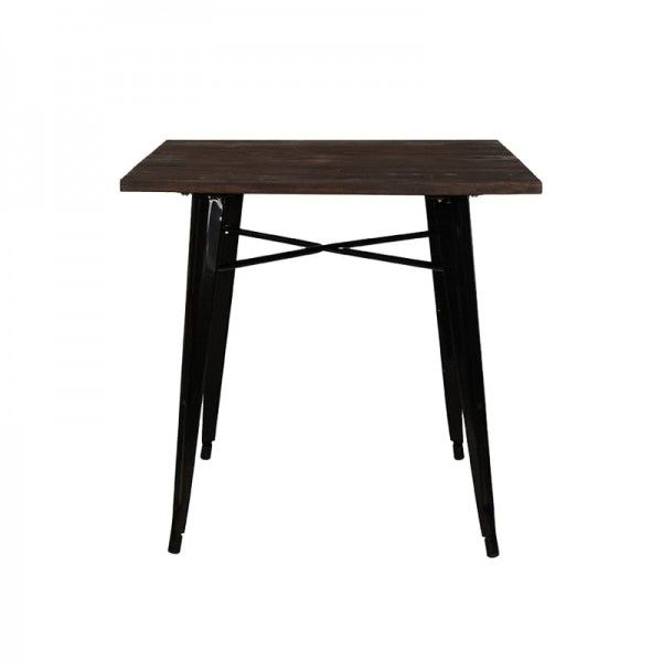 Mesa cuadrada, fabricada en estructura metálica y base sólida de madera con acabado texturizado.