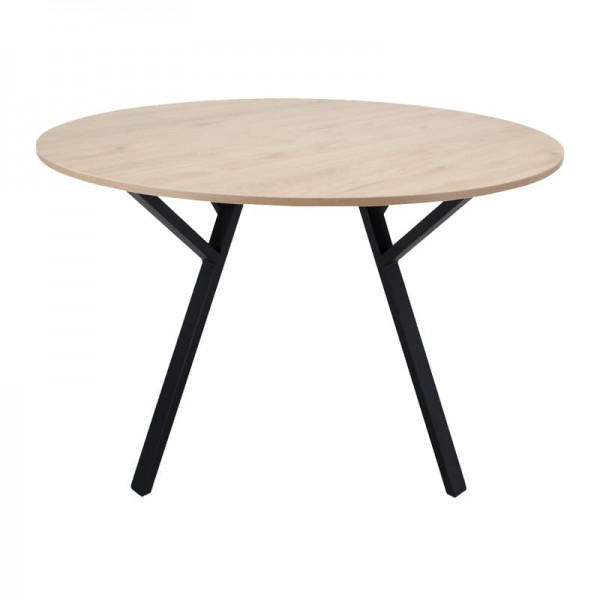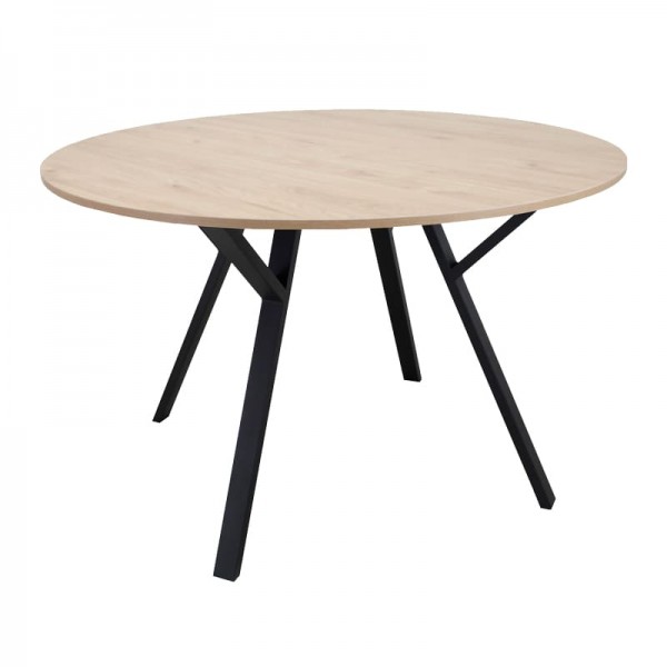 Mesa circular con resistente base de metal y cubierta de melamina resistente al calor.