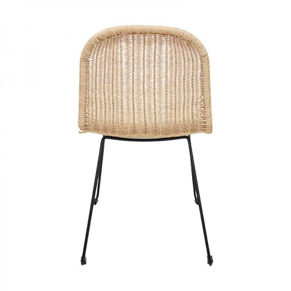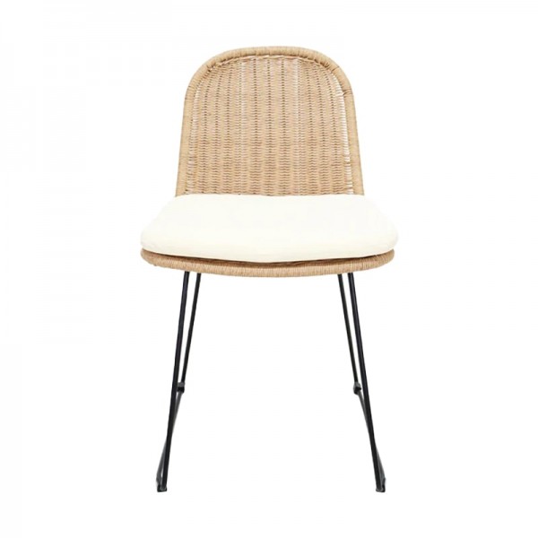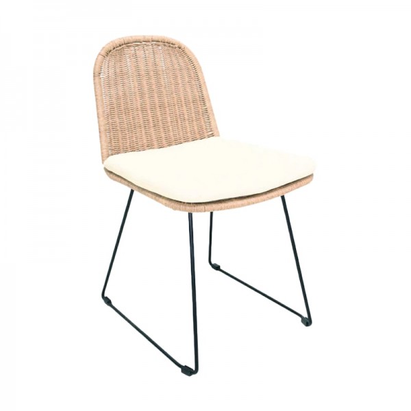 Silla de exterior con base metálica, soporte de rattan sintético y cojín.
