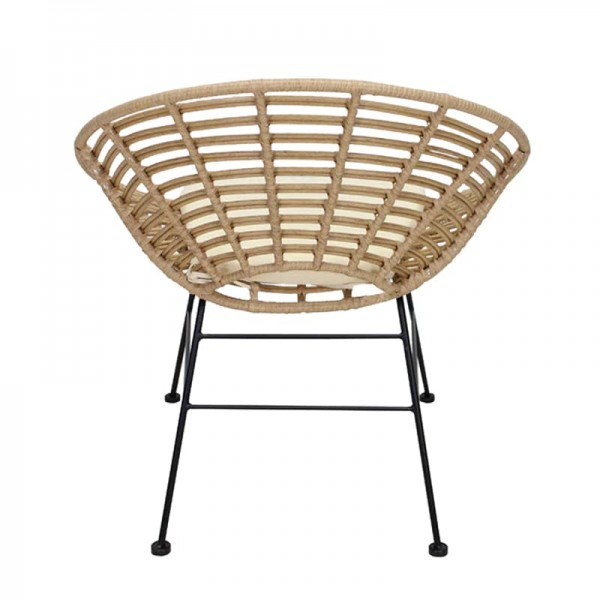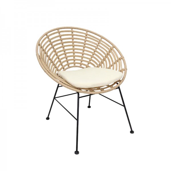 Silla de exterior con base metálica, soporte de rattan sintético y cojín.