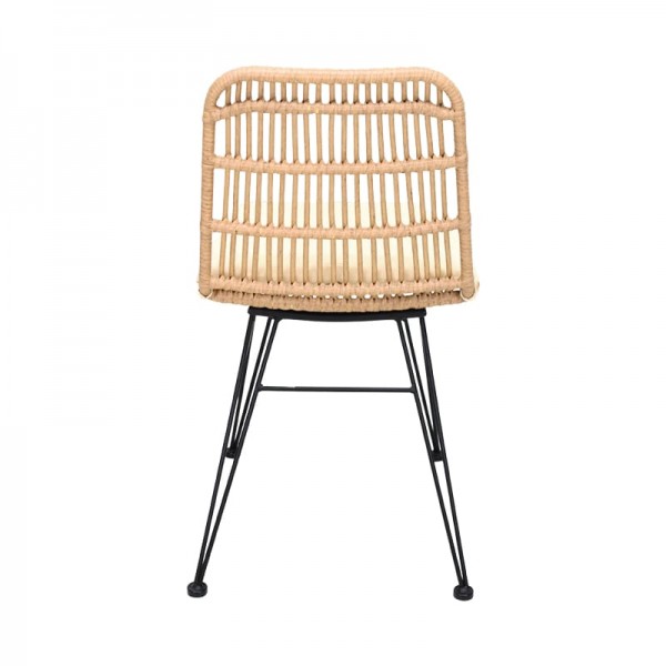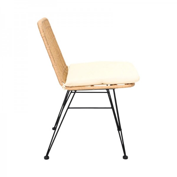 Silla de exterior con base metálica, soporte de rattan sintético y cojín.