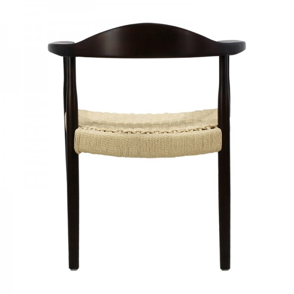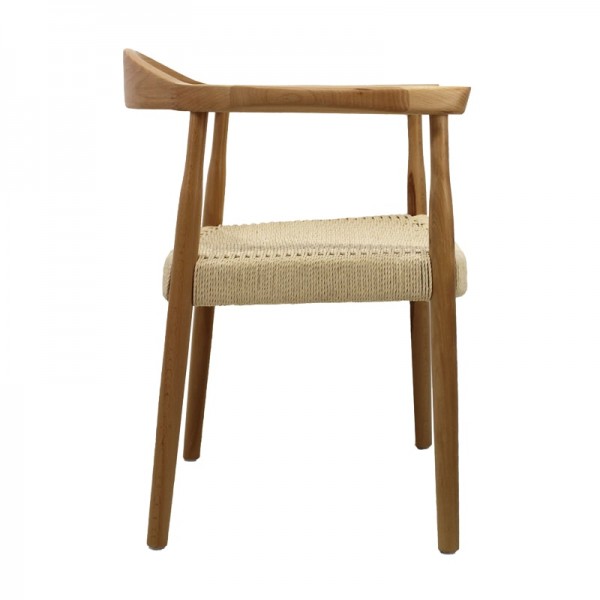 Silla de madera maciza, cuenta con un respaldo curveado, asiento de papel trenzado impermeable y cuatro soportes.