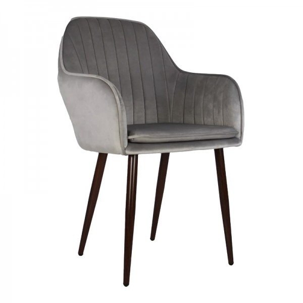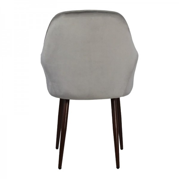Silla con base de metal y asiento de madera con espuma tapizada en terciopelo.