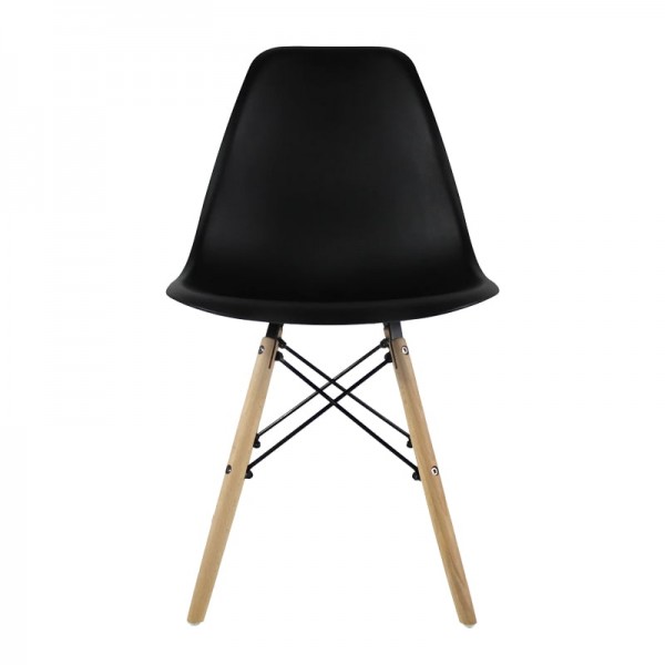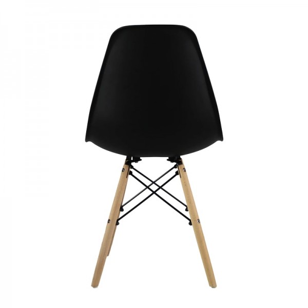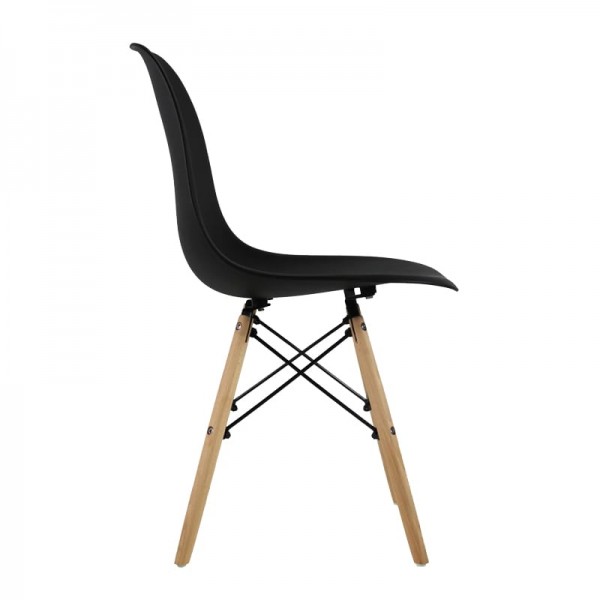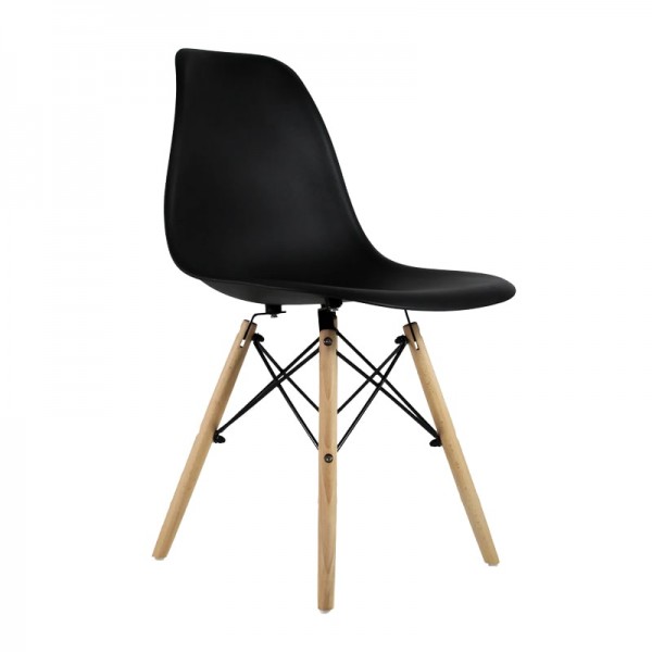 Silla con base de madera y soporte de metal, asiento de polipropileno liso.