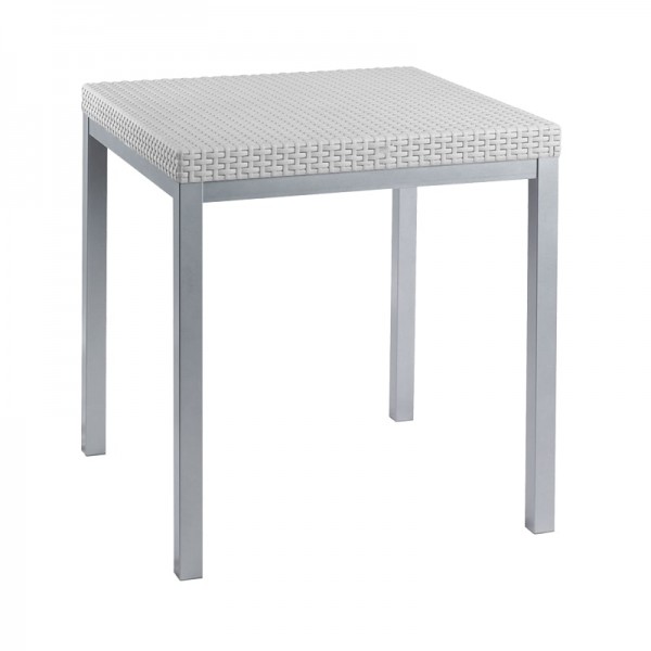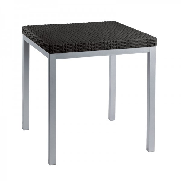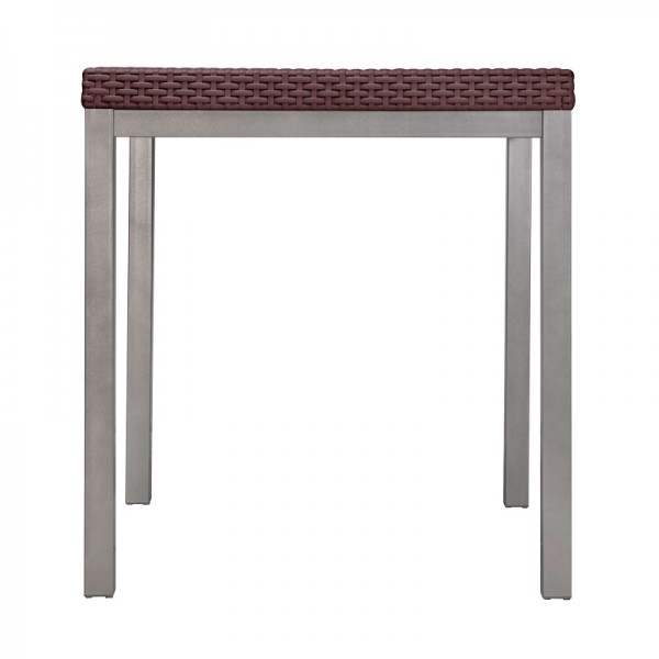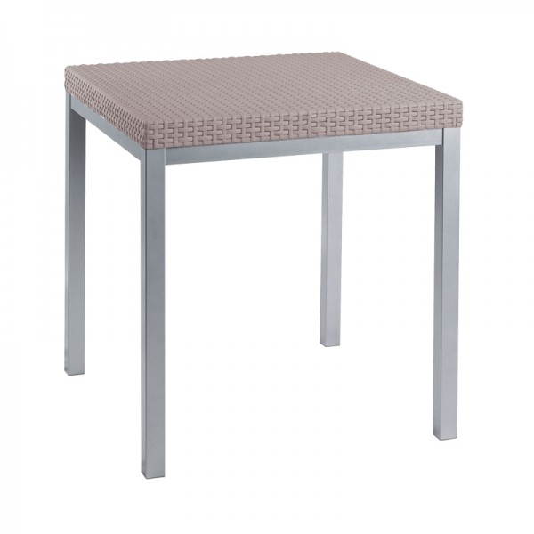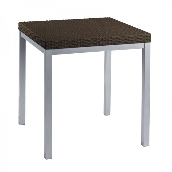 Mesa auxiliar de perfil cuadrado tubular de aluminio, travesaños de perfil rectangular tubular de aluminio y separador de perfil redondo tubular de aluminio, tratamiento anodizado y terminado natural. cubierta de copolímero de polipropileno en imitación rattán resistente a los rayos uv y al ambiente salino.